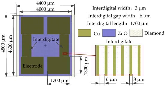 The phonon piezoelectric device of the NV center is designed on the basis of the optimized structure in Section 3. The size of the diamond with the NV center is 4800 μm × 4400 μm × 1000 μm. The size of the (100) ZnO is 4600 μm × 4400 μm × 400 μm. The width of the interdigital is 3 μm. The width of the interdigital gap is 6 μm. The thickness of the interdigital gap is 300 nm. The thickness of the electrode is 1 μm. The MEMS structure size of the phonon piezoelectric device of the NV center is shown in Figure 16.