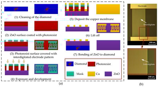 We use MEMS technology to prepare the phonon piezoelectric device of the NV center. Figure 17a shows the specific MEMS implementation process: (1) Clean the diamond samples; (2) ZnO surface coated with photoresist; (3) photoresist surface covered with interdigitated electrode pattern; (4) exposure and development; (5) deposit the copper membrane, and the thickness ratio of the titanium adhesion layer and the copper is 1:5; (6) lift off—the sample was placed in an acetone solution, and the photoresist and the metal layer above are stripped off under the ultrasonic waves; (7) Bonding of ZnO to diamond. The prepared phonon piezoelectric device of the NV center was characterized by an M330-HK830 optical micrograph (Its manufacturer is AOSVI, which is located in Shenzhen, China), as shown in Figure 17b.