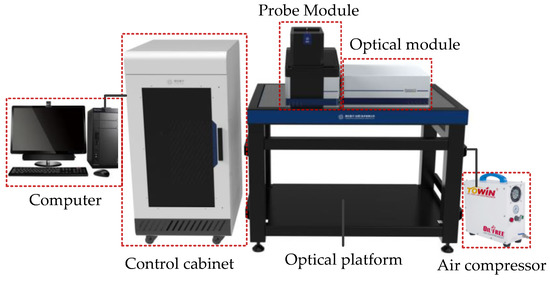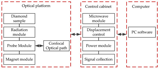 The temperature, humidity, and air pressure of the NV center measurement carried out are in natural conditions. The experimental platform is the quantum diamond single-spin spectrometer system (Its manufacturer is CIQTEK, which is located in Hefei, China), as shown in Figure 18. This system is divided into multiple submodules, including the optical module, probe module, magnet module, microwave module, arbitrary sequence generation module, radio frequency module, main control module, power module, optical stabilization platform, workstation, air compressor, and other parts. The optical platform is used for the vibration isolation of the optical path and the probe module. Microwave modules, power modules, main control modules, and arbitrary sequence generation modules are placed in the control cabinet. The diamond sample, the radiation module, the probe module, and the magnet module interact with the control cabinet through the computer. The block diagram of the quantum diamond single-spin spectrometer system is shown in Figure 19.