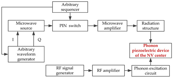 The prepared phonon piezoelectric device is coupled to the probe module. It is excited by a radio frequency signal generator through a phonon excitation circuit. The schematic diagram of the architecture of the phonon-coupled manipulation module is shown in Figure 20.