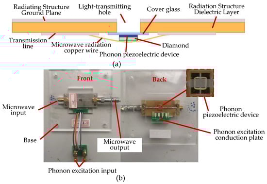 The schematic diagram and physical photograph of the phonon-coupled radiation structure are shown in Figure 21a,b. The radio frequency signal generator generates a phonon excitation source by amplifying the radio frequency signal. The phonon-coupled radiation structure is connected to the radio frequency amplifier through the phonon excitation conduction plate and the phonon excitation input SMA port. The phonon device of the NV center is placed on the glass slide above the optical hole of the radiation structure and is the core component of the phonon-coupled manipulation module.