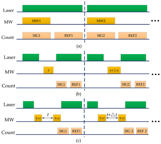 (a) ODMR measurement sequence. (b) Rabi measurement sequence. (c) Ramsey measurement sequence.