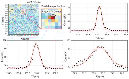 Characterization of the diamond with the NV center is shown in Figure 23. It has superior manipulation and measurement capabilities when selecting a single NV center point in a relatively pure area near the copper wire. The fluorescence in the range centered on the single NV center is scanned and counted along with the X, Y, and Z-axis directions, and the fluorescence scanning curve is also shown in Figure 23. It has a distinct unimodal characteristic, which indicates that the selected NV center is effective.