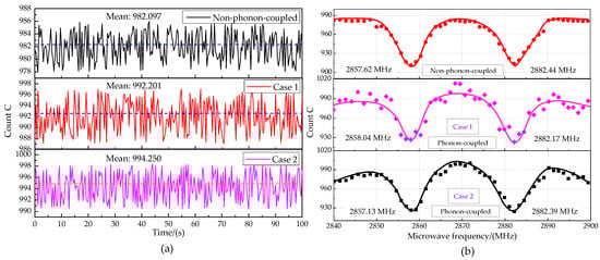 We applied 350 MHz acoustic excitation and a 4.6 G magnetic field along the NV axis. Time-domain measurement at the MW frequency of 2870 MHz and the ODMR spectrum for different cases are shown in Figure 24, including the non-phonon-coupled case and the phonon-coupled case (including Case 1 and Case 2). In Case 1, IDT is deposited on the surface of the (100) ZnO piezoelectric membrane layer. In Case 2, IDT is deposited on the interface of the diamond and (100) ZnO piezoelectric membrane. The time-domain measurement result shows that the phonon-coupled case with the average fluorescence count at the MW frequency of 2870 MHz is about 992 within 100 s. That count for the non-phonon-coupled case in the same condition is about 982. It can be shown from the ODMR spectrum that the state is split into and . The microwave resonance frequencies for the non-phonon-coupled case are 2857.62 MHz and 2882.44 MHz. The microwave resonance frequencies for the phonon-coupled case are about 2857 MHz and 2882 MHz, both of which are symmetrical, about 2870 MHz. However, the fluorescence intensity for the phonon-coupled case is higher than that of the non-phonon-coupled case. In Case 1 and Case 2, the average fluorescence intensity increased by 1.02% and 1.29%, respectively, compared with the non-phonon-coupled case. The possible reason is that more photons jump with phonon-coupled manipulation. This phenomenon is more obvious around microwave frequencies. The bandwidth of the resonance peak for the phonon-coupled case is larger. Compared with Case 2, the fluorescence intensity is more unstable for Case 1.
