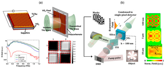 VO2 thin films on both sides of sapphire substrate driven by electric current are prepared into a 2 × 2 array with pixel size of 4 × 4 mm2 [76]. As shown in Figure 6a, the modulation depth is greater than 95% over 0.13–0.9 THz. Gaps of 0.7 mm are kept between adjacent pixels, so that the crosstalk is less than −30 dB. However, the power consumption will increase severely as the number of pixels becomes large. In Figure 6b, Zhu group pumps the 180 nm thick VO2 film using a DMD encoded 800 nm fs pulse [77] with fluence of 14 mJ/cm2. VO2 changes from the insulating state to the metal state 50 ps after the femtosecond excitation, and the overall modulation depth is 30%. THz super-resolution imaging with resolution of λ/133 is realized by near-field modulation and compressed sensing technology.