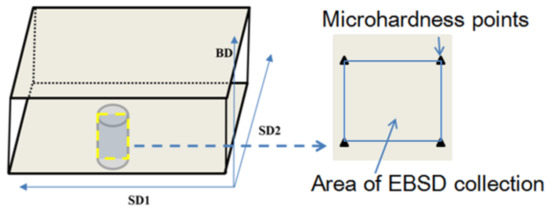 EBSD samples needed to be prepared before analysis. As pecific sample preparation process was followed. First, the sample surface was polished to a particle size of 2.5 μm using silicon carbide grinding papers from 180 to 1200 grit. Second, the sample surface was subsequently electro-polished (electro-polishing refers to the process in which metal is subjected to special anodic treatment in a certain composition of polishing liquid to obtain a smooth and bright surface)—in a solution of HNO3:CH3OH (1:10 volume fraction) under 20 V for 15 s.