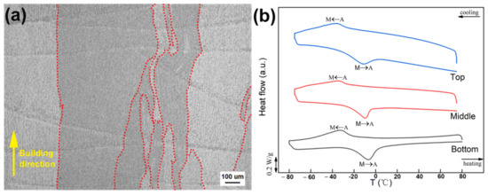 (a) Metallographic photos and (b) DSC curves of the bottom, middle, and top positions along the deposition direction.
