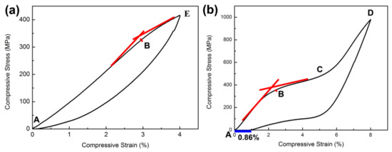 The LDED sample was compressed on anMTS mechanical testing machine according to 4% and 8% deformation of the original size. The stress–strain curve of compression is shown in Figure 4. When the sample was at 4% deformation, the recovery rate was 100%. However, it had 10% plastic deformation, with 8% compression deformation. It is noteworthy that in the compression deformation at 4%, as shown in Figure 4a, the critical stress for stress-induced martensitic transformation was about 360 MPa and the critical strain was about 3% (determinedby the tangent method, and point E is the end point of 4% deformation). The difference in the critical strain is due to the compression of the sample through a smaller strain, which activates the deformation path of more martensitic variants [42], and stress-induced martensitic transformation is more likely to occur under a large strain.