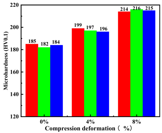 Microhardness values of samples at 0%, 4%, and 8% compressive deformation.
