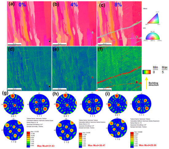 EBSD analysis of different samples: (a–c) inverse pole figure orientation contrast maps of the original state, 4% deformation, and 8% deformation samples, respectively; (d–f) KAM images of the original state, 4% deformation, and 8% deformation samples, respectively; and (g–i) pole figures of the 0% deformation, 4% deformation, and 8% deformation samples in {001}, {110}, and {111}, respectively.