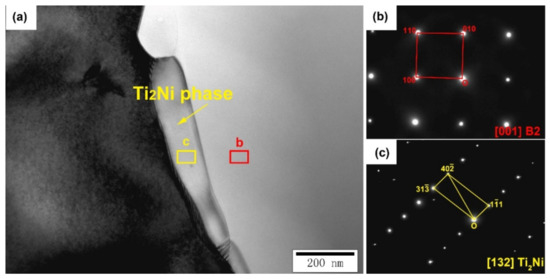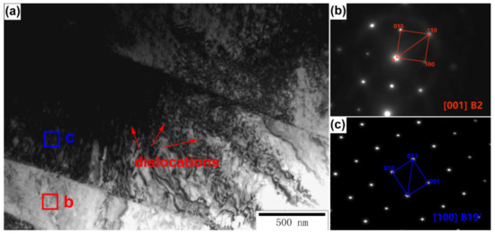 The quasi-in-situ TEM samples with different deformations were cut by an FIB. The phase morphology of the original sample is shown in Figure 7a. We concluded that there wasno obvious dislocation aggregation phenomenon in the original sample and there were two different phases in the original sample, which are marked as regions b and c. The selected area electron diffraction (SAED) of regions b and c is shown in Figure 7b and Figure 7c, respectively. Region b is the B2 parent phase. Region c was the Ti2Ni phase, which is the main precipitation phase of the material.