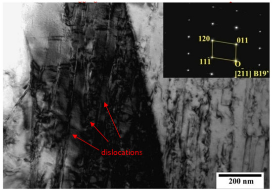 When the sample was subjected to 4% deformation, the microstructure of the material changed significantly. As shown in Figure 8, there was obvious dislocation aggregation in the quasi-in-situ area of the sample. Meanwhile, the phase of the material did not change significantly and the whole quasi-in-situ area of the sample was still mainly the B2 parent phase. However, it is worth noting that a small amount of the B19’ martensite phase had begun to exist in the individual positions of the quasi-in situ region. The morphology of dislocation aggregation and SAED of the B19’ martensite phase are shown in Figure 8.