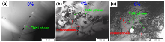 TEM bright-field images of (a) 0% compressive deformation, (b) 4% compressive deformation, and (c) 8% compressive deformation samples.