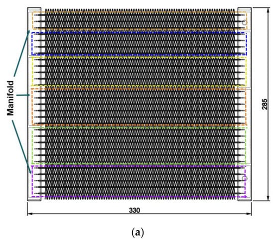 The flat tube evaporator was designed with a heat transfer area of 2.5 m2 and a cooling capacity of 2.6 kW. Figure 1 displays the dimensions of the microchannel evaporator. The evaporator is composed of 29 flat tubes and divided into 6 passes. There are 3, 4, 5, 6, 6 and 5 flat tubes in the first, second, third, fourth, fifth and sixth pass, respectively. Each flat tube has 10 rectangular microchannels with dimensions of 1.2 mm × 0.6 mm.