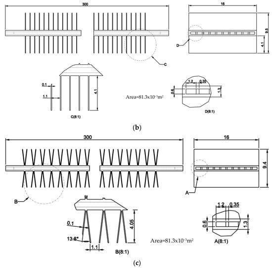 Dimensions of the microchannel evaporator: (a) Front view; (b) A flat tube drawing with the straight fins; (c) A flat tube drawing with the V-fins.
