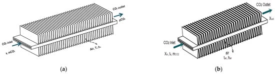 Figure 2 shows two flat tube models of the CO2 microchannel evaporator. The CO2 flows inside the flat tube, and the air is outside with the convective heat transfer. To determine the variations of the vapor quality at the evaporator inlet, the EES software [] was used based on some initial conditions and the pressure–enthalpy diagram of R744.