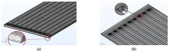 In Figure 3, the finite elements in the grid meshes of the straight fin model were partitioned to be triangular. For the fluid flow, the boundary layer was divided into 5 layers to investigate the characteristics of the wall, as shown in Figure 3a. For important parts, the finer mesh level was used, i.e., the edges of the corners in the microchannels were surveyed on 4 different levels (1, 10, 20, 30), as shown in Figure 3b. For the V-fin model, the method and the meshing level are the same as in the straight fin model. The model consists of approximately 610,000 domain elements and 122,000 boundary elements. The average number of degrees of freedom (DOF) was 11,300,000 (plus 134,000 internal DOFs). The parallel sparse direct solver (PARDISO) algorithm is a solver that was developed based on the linear equation system. The relative tolerance was set at 10−6. For numerical simulation in this study, the COMSOL Multiphysics software-version 6.0 was used with the PARDISO solver.