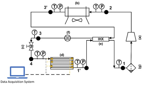 Schematic of the test loop for CO2 air conditioning system: (a) a CO2 compressor; (b) a gas cooler; (c) a throttle valve; (d) a microchannel evaporator; (e) an internal heat exchanger; (f) a flow meter; (g) a gas–liquid separator.