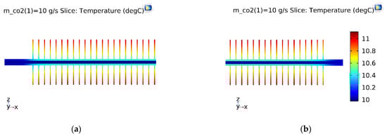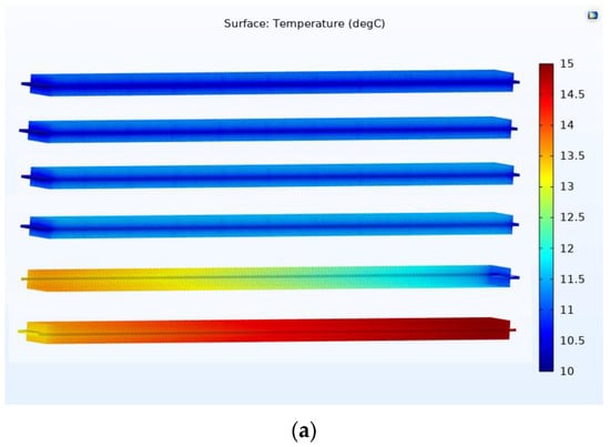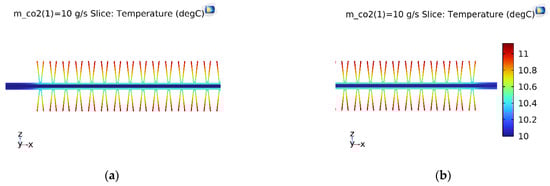 The experimental data obtained from the test loop were under the ambient (outdoor) temperature of 33 °C. The inlet evaporative temperature and inlet vapor quality were fixed at 10 °C and 0.61, respectively. The temperature slice of the straight finned flat tube is shown in Figure 7. The inlet and outlet refrigeration temperatures of the straight finned flat tube were the same in the first pass of the microchannel evaporator; this result is consistent with the theory of evaporation. The temperature of the fins was about 1 °C higher than that of the CO2 refrigerant.