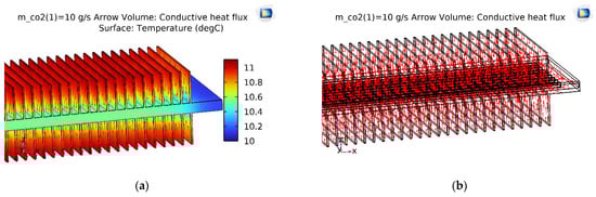 With the same initial simulation conditions, the temperature slice on the V-finned flat tube was the same as that obtained from the straight finned flat tube, as shown in Figure 8. The temperature profile obtained from the straight finned flat tube was also the same as that obtained from the V-finned flat tube, as shown in Figure 9 and Figure 10. However, the arrows of the heat fluxes were different for these two types. The conductive heat flux of the V-finned flat tube model was more concentrated in the connection location between the fins and the flat tube.