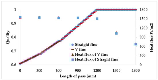 Figure 11 shows the vapor quality of the straight finned flat tube evaporator model and the V-finned flat tube evaporator model at the evaporative temperature of 10 °C. Due to the same heat transfer area (2.5 m2), the straight fins had a height of 4.1 mm, and the V-shaped fins had a height of 4.05 mm (Figure 1). Therefore, the simulated vapor qualities in these two cases were the same. Each microchannel pass of the evaporator had a length of 300 mm. The evaporation of the refrigerant took place in four passes, so the normal heat flux from the air through the fins and tubes was almost reached at 1550 W/m2. It was observed that the saturated vapor state (dry state) was achieved at the outlet of the fourth pass. When the CO2 was superheated, the normal heat flux rapidly declined from 1550 to 700 W/m2. From Figure 7, Figure 8, Figure 9, Figure 10 and Figure 11, with the same heat transfer area and the heat transfer coefficient for the air side, the effect of the fin shape on the heat transfer of a microchannel evaporator was no different between the straight fin model and the V-fin model.