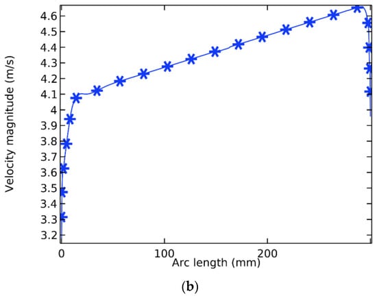 Figure 12 shows the velocity field of the refrigerant along the length of the flat tube at the evaporative temperature of 10 °C. At the inlet, the velocity rose sharply because the refrigerant from the manifold entered the microchannel with a smaller cross-section. The velocity increased gradually in the microchannel; this was due to the mixture density decreasing. At the outlet, the velocity fell rapidly due to the refrigerant leaving the microchannel to enter the manifold, which saw the cross-section increase suddenly.