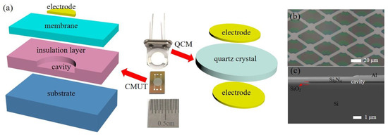 As presented in Figure 1a, a basic CMUT unit is composed of a top electrode, a rigid substrate that also serves as the bottom electrode, and a movable membrane that is isolated from the substrate by an insulation layer and a vacuum cavity. Generally, hundreds or thousands of such electrically connected units comprise a CMUT sensor. The structure of a QCM is much simpler. It consists of a quartz crystal sandwiched by the top and bottom electrodes.
