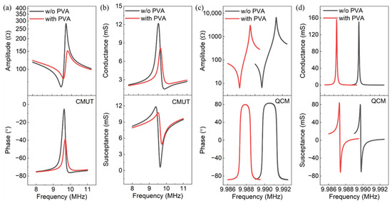 Figure 4 presents the impedances and admittances of the CMUT and QCM before and after coating of the PVA film. It is shown in Figure 4a,c that the resonance frequencies of the bare CMUT and QCM were 9.714 MHz and 9.991 MHz, respectively, both of which were close to the designed 10 MHz. After functionalization by the PVA layer, while the resonance frequency of the QCM decreased by 2.85 kHz due to the loaded mass of the sensing material, the CMUT exhibited a frequency increment of 82 kHz. The increased resonance frequency of the CMUT can be explained by a multilayered thin plate model [32,33], the details of which are presented in Appendix A. During operation, the thin PVA layer vibrates together with the resonant membrane of the CMUT. Therefore, the two layers can be considered as a laminate structure. How the PVA film affects the resonance of the bare CMUT depends mainly on its material properties. The film with higher Young’s modulus and lower density will increase the resonance.