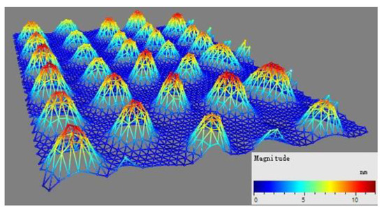 Generally, a high quality factor of 300–500 is achievable by the CMUT despite the massive parallelism [34], because only one side of its resonant membrane faces air damping while the other side is vacuum-sealed. The low quality factor here was likely caused by its fabrication process. Our equipment (Phantom II Reactive-ion Etching system, Trion Technology Inc., Clearwater, FL, USA) had unstable power during the reactive-ion etching (RIE) process, which led to the non-uniform etching of the cavities and further a relatively low quality factor. The hypothesis was verified by the laser vibrometer measurement (DD-300 displacement decoder, OFV-5000, Polytec Inc., Irvine, CA, USA). Figure 5 presents the 2D scan of the membrane displacement of the CMUT when it was biased at 35 V and excited by a 1 Vpp continuous sinusoidal signal. A strong vibration was observed for all scanned membranes, showing the good functionality of the device. Although the difference among individual membranes was small, it caused energy dissipation and decreased the quality factor of the sensor. The uniformity could be improved by optimizing the etching recipe or the fabrication process, such as replacing the RIE etching step with wet etching and redeposition of the oxide insulating layer.