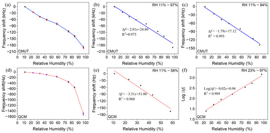 Figure 6a,d shows the frequency responses of the CMUT and QCM sensors to various RH levels from 11%RH to 97%RH, respectively. The resonance frequency at 11%RH was used as the benchmark. Error bars in the figures represent the standard deviations of three separate measurements. Both sensors exhibited satisfying reproducibility with maximum deviations of ±3.8% and ±4.3% at 97%RH, respectively.