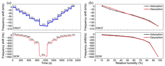 Figure 7a compares the real-time frequency responses of the sensors as the RH levels gradually changed from 11% to 97% and then back to 11%. The frequency shift of the CMUT sensor between adjacent RH levels can be easily identified due to its linear response, while it was hard for the QCM sensor at RH levels below 43%. Figure 7b illustrates the hysteretic curves of the sensors. The adsorption and desorption curves overlapped well for both sensors, indicating low hysteresis.