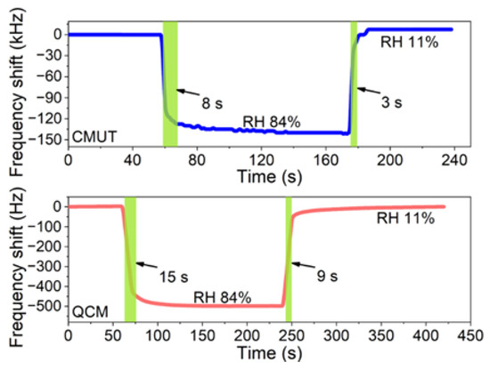 The dynamic frequency responses of the CMUT and QCM sensors were evaluated as the RH switched between 11% and 84%. Figure 8 highlights the 90% response and recovery zones. The response/recovery times of the CMUT and QCM sensors were 8 s/3 s and 15 s/9 s, respectively. The faster response and recovery speed of the CMUT sensor was the benefit of its microstructure. As the microscale resonant membrane of the CMUT was ultra-lightweight, the air damping it withstood was considered significant, which helped to stabilize the resonance frequency faster during the change in RH.
