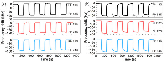 Repeatability of the sensors as the RH level switches from 11% to 58%, 75%, and 84%: (a) CMUT; (b) QCM.