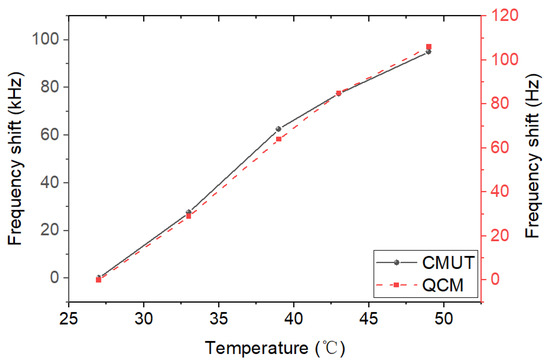 Frequency shifts of the CMUT and QCM sensors as a function of temperature.