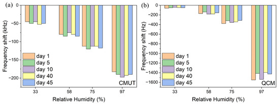 The long-term stability of the sensors was investigated by measuring their frequency shifts in different RH environments a few times over 45 days. Figure 11 displays the long-term stability performance of the CMUT and QCM sensors. The frequency shifts of both sensors were in good agreement at the same RH level on different days, indicating good long-term stability. The largest deviations over time were at 97%RH. Therefore, it is preferred to keep the sensors in lower RH environments.