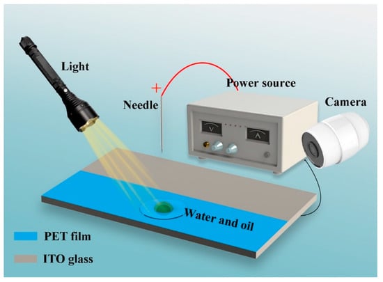The experimental setup is shown schematically in Figure 1. A needle-plate electrode configuration was set up to generate corona discharge. The plate electrode was ITO glass (Xiangcheng & Technology, Shenzhen, China) with a resistance less than 6 Ω and size of 100 × 100 × 0.5 mm3. A piece of polyethylene terephthalate (PET) blue film with a surface roughness of 1.76 nm (Huajiu, Shenzhen, China) covered one side of the ITO glass with size of 100 × 50 × 0.5 mm3. The needle was placed vertically 40 mm above the center of the PET film and fixed with a platform. The needle was connected to the positive electrode of a high-voltage direct current (DC) power source (Dongwen Corp., Dalian, China), which can supply voltages varying from 0 kV to 30 kV. The ITO glass was connected to the negative electrode of the high-power source. The working fluid was deposited onto the PET film with a micro-syringe for each test, The experiments were conducted at ambient temperature and pressure conditions. To visualize the dynamic behavior of the droplet, a high-definition camera (Sony Corp., Tokyo, Japan) with a Laowa 60 mm lens (Laowa, Wuhan, China) was employed. A light source was located on the opposite side.