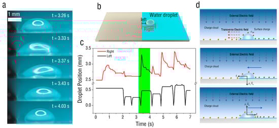 At the beginning of the experiment, a deionized (DI) water droplet of volume 2 μL was placed on the PET film surface (Figure 2b). The horizontal distance between the left end of the droplet and the ITO glass was 0.55 mm. The corona voltage was kept constant at 8 kV. When the needle tip corona discharged, the position of the water droplet changed, as shown in Figure 2c. Initially, the droplet started to stretch horizontally towards the ITO glass. After 2 s, the water droplet began to oscillate at the edge of the PET film. A high-definition image for one oscillation period of the water droplet can be seen in Figure 2a (green mark in Figure 2c). First, the left end of the water droplet started to move toward the ITO glass. When it contacted the ITO glass, the water droplet started to stretch, moving to the right. Finally, the left side of the water droplet remained unchanged, and the right end gradually shrank. Therefore, we found that the water droplet on the film exhibited periodic oscillation movement accompanied by transverse stretching and shrinking driven by the corona discharge. This movement pattern of the water droplet is similar to the oscillating movement of a droplet between two electrodes in an electric field []; the principle is presented in Figure 2d. At the onset of corona discharge, the positive ions, generated due to the ionization process, drift towards the PET film and the deposited water droplet. Interaction of the strong electric field and the surface charges deposited on the water droplet creates an interfacial electrical pressure. Therefore, the water droplet starts to stretch. At the same time, negative charges are induced on the ITO glass, and a transverse electric field is formed at the interface to drive the water droplet to the left. Subsequently, the water droplet contacts the ITO glass and exchanges charge with it, and then moves to the right due to electrostatic repulsion. When the negative charge on the water droplet is neutralized by the positive charge on the PET film, the water droplet is again charged with the positive charge, and then the water droplet starts a new oscillation cycle.
