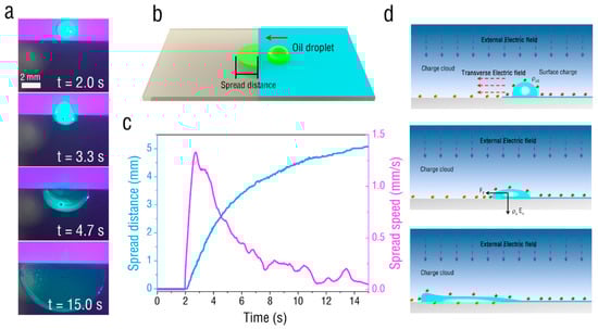Next, the water droplets were replaced by oil droplets, and the movement of oil droplets under the action of corona discharge was observed, as shown in Figure 3a. The oil droplets were of olive oil and were labeled with fluorescence. Initially, the oil droplet started to stretch horizontally towards the ITO glass. Subsequently, the oil droplets almost completely diffused to the ITO glass, and the spread area gradually increased with time. To evaluate the speed of spreading of oil droplets, the distance from the spread front end to the film boundary was taken as the spread distance, as shown in Figure 3b. In Figure 3c, the time evolution of the spread speed and spread distance of the oil droplets on ITO glass is shown. It can be seen that the spread distance of the oil droplets gradually increased with the onset of the corona discharge. The maximum spread speed of 1.32 mm/s resulted from the initial stage of diffusion (t = 2.7 s), and then the spread speed gradually decreased. The spreading principle of oil droplets is shown in Figure 3d. Under corona discharge, the oil droplets on the PET film, like the water droplets, are also subjected to interfacial electrical pressure and a transverse electric field force, driving the oil droplets to move in the ITO glass direction. Unlike water droplets, oil droplets are poor conductors of charge. After it contacts the ITO electrodes, most of the charge on the surfaces will not be rapidly conducted away, so that the oil droplet continues to be subjected to the lateral electric field force and the interface electric pressure, driving the oil droplets to diffuse to the ITO glass surface. With increase in the oil droplet spread distance, the transverse electric field force also gradually decreases.