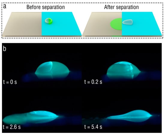 The above experiments demonstrate that there are obvious differences in the areas where the oil droplets and water droplets finally occur on the plate electrode due to different conductivity. Following these, whether the contactless separation of oil and water droplets can be realized by corona discharge was tested. First, olive oil (2 μL) and DI water (2 μL) were placed on the PET film, and the oil droplet and water droplet were labeled with different fluorescence, as shown in Figure 4a. After the corona discharge was turned on, the motion behaviors of the oil and water droplets were recorded in real time using an HD camera under the irradiation of a UV lamp, as shown in the Figure 4b. The time to turn on the corona discharge was 0 s. It can be seen in the figure that, when the corona discharge acts on the oil droplet and the water droplet, the oil droplet covers the water droplet and they then move to the boundary together. When the oil droplet and water droplet contact the boundary, the oil droplet continues to diffuse to the ITO glass surface, while the water droplet stays on the PET film. It is worth noting that the surface of the water droplet is always covered with a thin oil layer, and that the oil layer gradually decreases with increase in time. The results demonstrate that the oil droplet and water droplet were separated to a great extent, confirming the effectiveness of corona discharge in separating the oil-water mixture.
