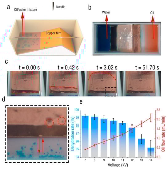 Based on the corona discharge separation principle and inspired by the EHD pump [], an efficient oil-water separation device was designed, as shown in Figure 5a. The device comprised a cuboid container of size 100 × 45 × 40 mm3 made by 3D-printing of photosensitive resin. The inside of the container had a slope a 16° and a length of 60 mm. The area 40 mm above the slope was covered with conductive copper film and connected to the grounding electrode. The needle tip was placed 40 mm above the center of the slope. Equal volumes of oil and water were mixed to prepare an oil/water mixture; the oil and water were dyed red and blue, respectively, for easy observation. Then the oil-water mixture was placed at the left end of the container and the liquid level of the mixture did not exceed that of the copper film. The corona voltage was set to 8 kV; when the corona discharge started, the oil gradually diffused to the copper film and finally covered the copper film, as shown in the Figure 5c. Most of the water droplets stayed at the bottom and oscillated at the boundary. However, a small portion of the liquid droplets moved on the copper film under the driving effect of the oil, as shown in the Figure 5d. Finally, the oil entered the right side of the container, while the water droplets stayed on the left side, as shown in Figure 5b. Figure 5e shows the water content in the oil and the flow rate of the oil droplets in the device under different voltages. It can be seen that, with increase in voltage, the separation speed of the oil droplets gradually increased, but the oil content in the oil region also gradually increased. The highest oil content was 99.25%, which was obtained when the corona voltage was 7 kV. This was because, when the voltage was increased, the effect on the oil droplets was increased, and many tiny water droplets were wrapped in the oil and could not be separated, so they entered the oil region.
