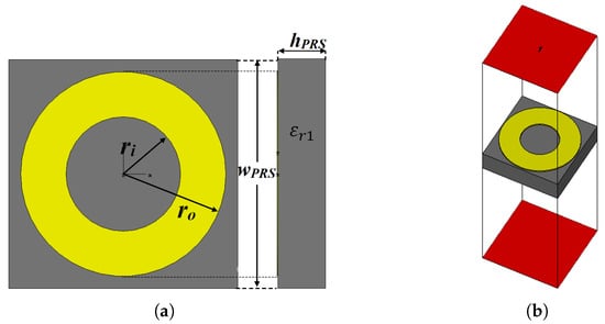The wavelength is taken at the antenna’s lower end frequency (25.1 GHz), which is 11.95 mm, and the corresponding estimated FPRA directivity (DFPRA) is approximately 16.53 dBi using both Equations (2) and (3). As a result, the aperture size of the proposed FPRA antenna is estimated using Equation (4), and it is approximately 25.52 mm × 25.52 mm. In order to accommodate the array of 7 × 7 PRS unit cells that make up the proposed FP resonator antenna, whose effective size is 3.8 mm, a PRS structure with an aperture size of 26.6 mm × 26.6 mm is used as the superstrate.