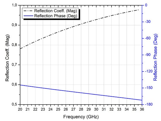 The setup for analysing reflection phase characteristics is shown in Figure 1b, where boundary conditions are applied as follows: along the ±x-axis, the Perfect Magnetic Boundary condition (PMC) is used, while in the case of the ±y-axis, the Perfect Electric Boundary condition (PEC) is applied. Two wave ports are set at a distance of , from the unit cell under investigation, along the z-axis, with an open boundary condition, so only the normal incidence is taken into account.