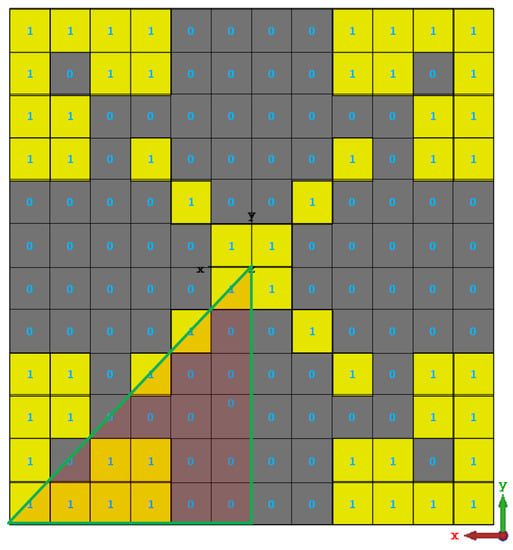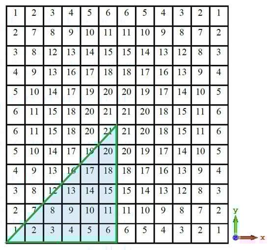 The necessity for 144 binary encoded pixels to represent a 12 × 12 discretised unit cell created a fairly large search space, making it impractical and time-consuming to find the best solution. In order to get around this, a four-folded symmetry is imposed, as seen in Figure 4. As a result, the search space for the ideal solution (the number of bits needed to represent the PRS unit cell) is drastically reduced to 21.