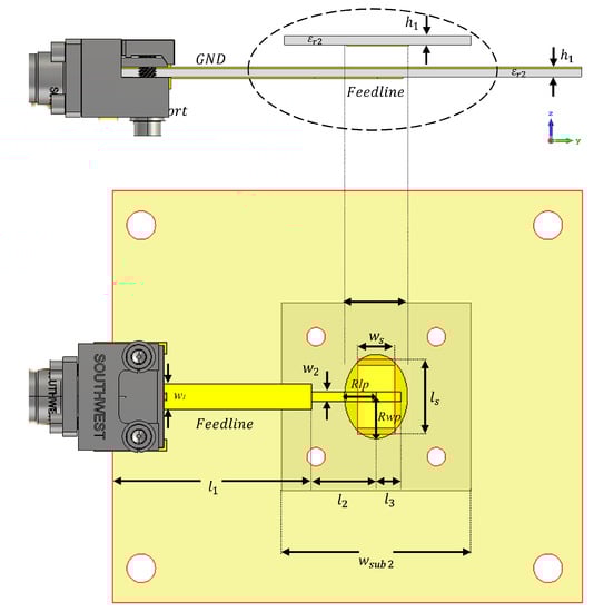 Figure 8 illustrates the suggested feed antenna design. It is made up of a parasitic patch that is coupled to a feeding line via a slotted ground plane (bottom layer) and separated by an air-gap hair of 1 mm for the suppression of surface waves, as the latter can affect the FRPA cavity’s performance [37]. The bandwidth is increased by adding an impedance matching network to the feedline. The substrate for the parasitic patch and the bottom layer (ground plane and feed line) is made of the Rogers RO3003 material, which has the following specifications: thickness (hs) = 0.254 mm, permittivity = 3.0, and loss tangent of 0.001). Table 1 lists a summary of the antenna design parameters.