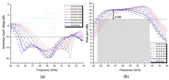 (a) The simulated reflection coefficient of the proposed FPRA and (b) peak gain at different spacing hc.