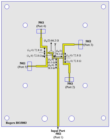 As a sequential feeding network for RHCP operation, a parallel feeding mechanism is utilised in this section and is shown in Figure 13. The parallel feeding network is composed of three parallel T-junction elements, one of which has an anti-phase feeding network and the other two of which have 90° phase differences in feeding networks [31].