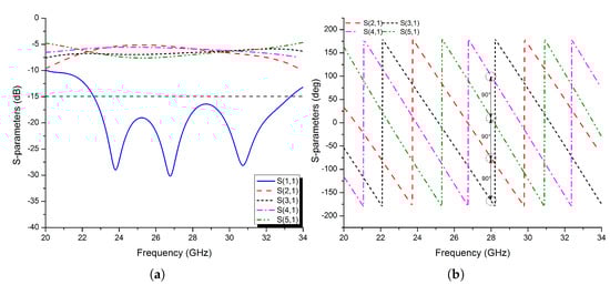 Figure 14a,b show the simulated amplitude and phase of the S-parameters of the parallel feeding structure. The parallel feeding network’s reflection coefficient (|S11|<−15 dB) ranges from 25 to 35 GHz. Over a wide frequency range, the maximum imbalance amplitude difference provided between ports 2–5 is less than 1 dB. Figure 14b clearly shows that each four-port has a nearly 90° phase difference with each other over the desired band.