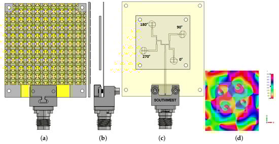 - Huang, J. A Ka-band circularly polarized high-gain microstrip array antenna. IEEE Trans. Antennas Propag. 1995, 43, 113–116. [Google Scholar] [CrossRef]