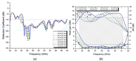 The simulated results are shown in Figure 16a,b. From there, it is observed that, as the cavity thickness increases, the impedance and AR bandwidth progressively increase, while the −3 dB gain bandwidth gradually decreases.