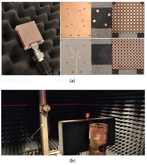 (a) The final fabricated antenna and its assembly parts and (b) far-field measurement setup.